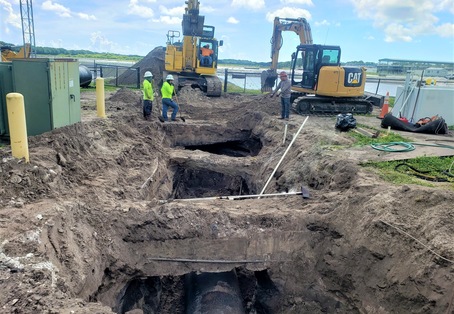 Seacoast’s award winning PGA Regional Water Reclamation facility incorporates the latest in pollution control and water recycling technology. This 12.0 million gallons per day state of the art treatment plant features a range of physical, biological, chemical and odor control processes operated around the clock. Hinterland Group is well under construction on the current upgrades to the Filter Pond Bypass, allowing the Utility to increase their capacity for backwash filter reservoirs within the plant. Several hundred feet of large diameter pressurized force main have been installed throughout the existing plant infrastructure. Our experienced crews most recently completed a section of pipe install which had multiple existing duct banks and utility conflicts quickly and without any incident. Kudos to team Hinterland for another job well done!